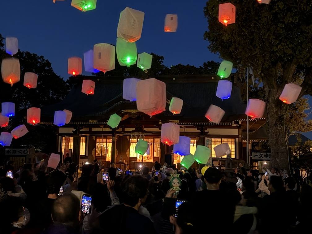 午後7時過ぎに拝殿前の照明を消しは一斉にランタンを打ち上げました