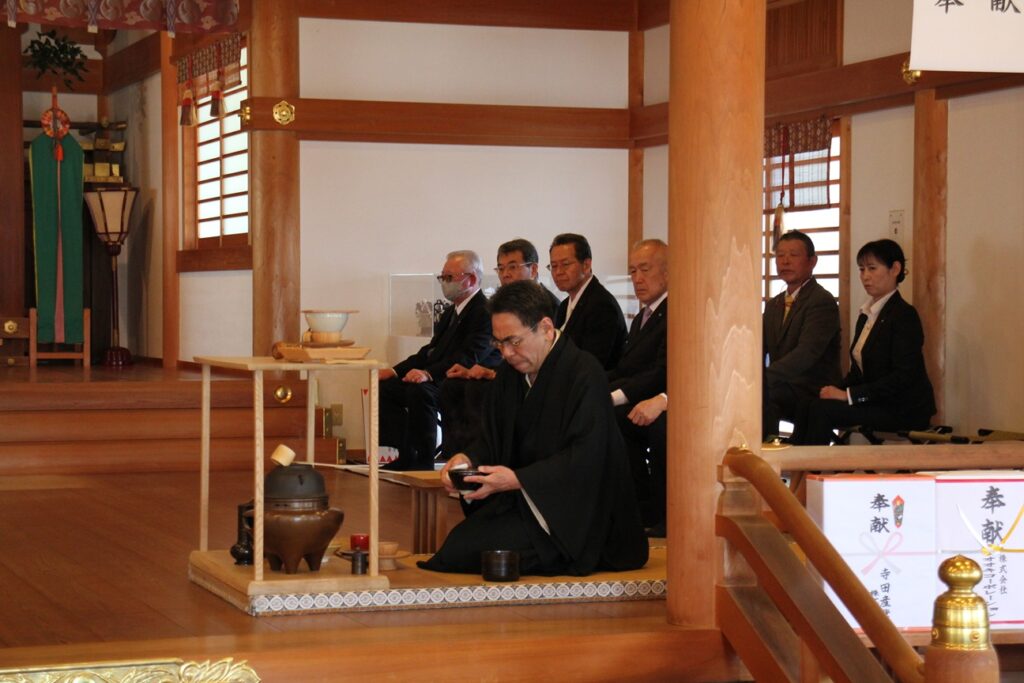 祭典中、藪内流家元に濃茶・薄茶を点てていただき御神前にお供え